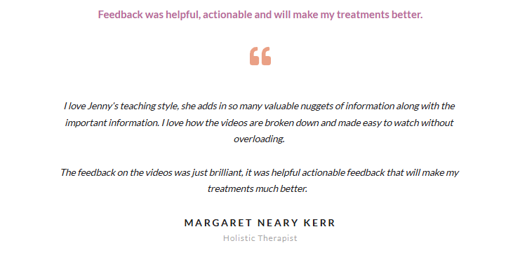 Absolutely fabulous course. I highly recommend it, great addition to your toolbox of therapies. It's a wonderful treatment to give and receive. Jenny’s laid back approach to teaching made this a very enjoyable course. I will definitely be back to learn more here