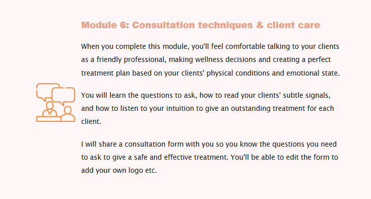 Affordable Investment: The course is priced competitively, with lots of payment options. And the Build your Business While You Train module will help you to build up a client base so you have paying clients waiting to book with you as soon as you qualify.