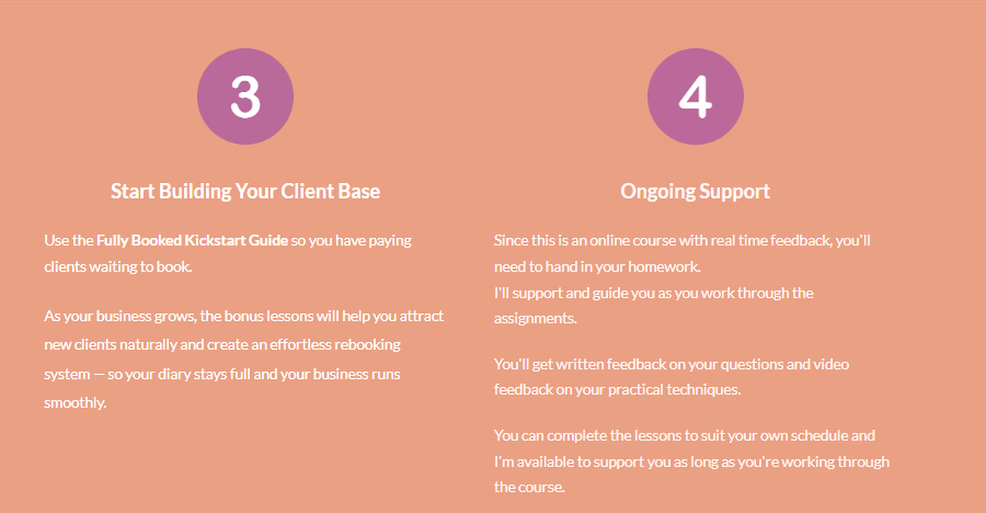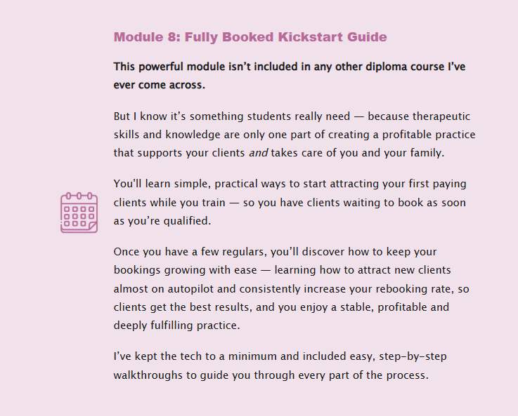 The next step is to put the short bonus lessons into action — they’ll show you how to attract new clients almost on autopilot, keep them coming back, and encourage referrals. That way, your diary keeps filling naturally week after week.